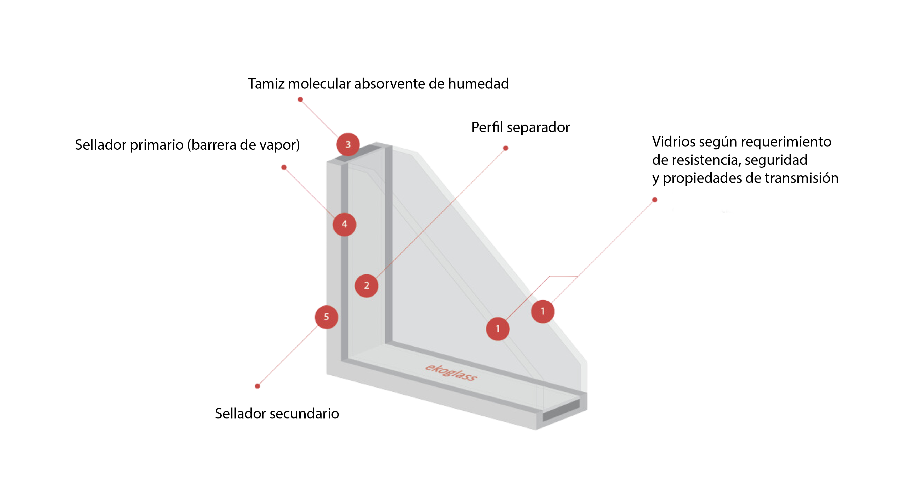 El doble vidriado hermético Ekoglass es un componente prefabricado compuesto por un conjunto de dos o más vidrios Float planos paralelos, separados entre sí por un espaciador, herméticamente sellados a lo largo de todo su perímetro, que encierra en su interior una cámara estanca de aire deshidratado o gases inertes para mejorar el comportamiento térmico y acústico (Norma IRAM 12598-1).