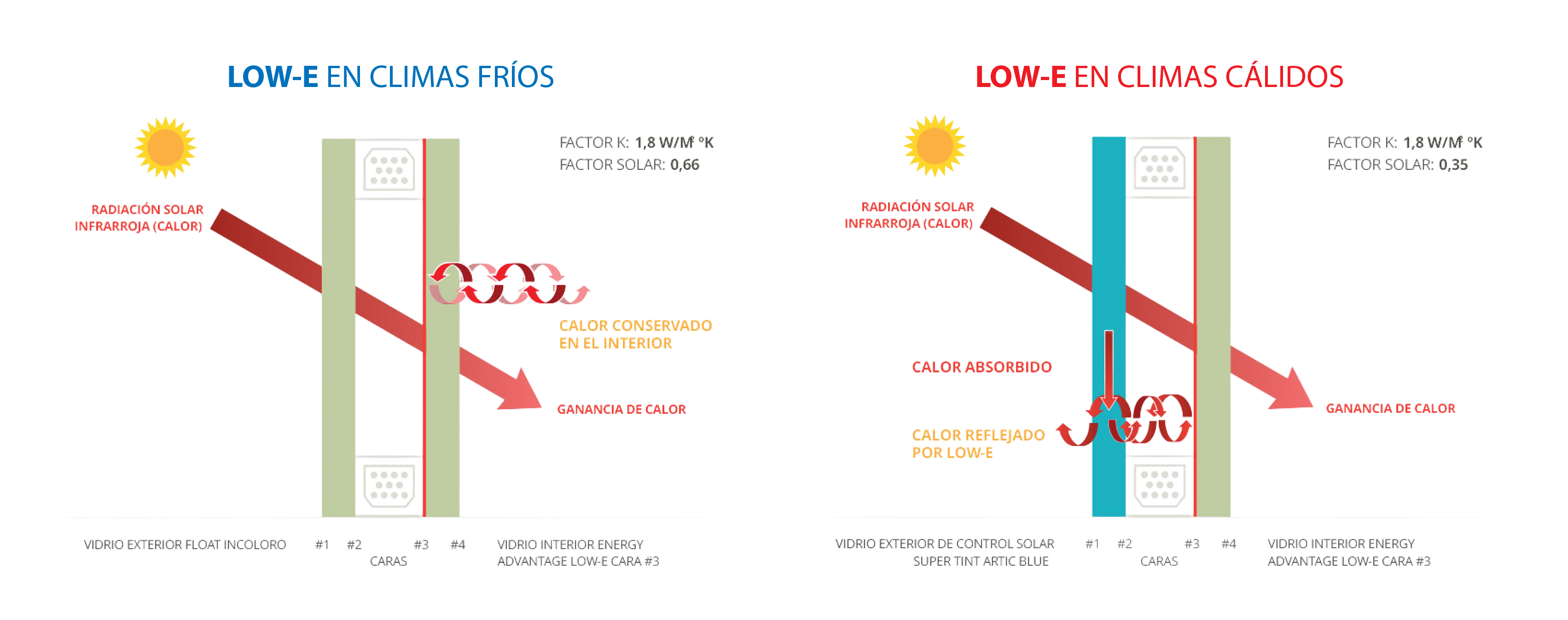 Por otro lado, el revestimiento Low-E refleja la radiación de calor de longitud de onda larga generada y emitida por los elementos que se encuentran en el interior de los ambientes de un edificio. La combinación en DVH – doble vidriado hermético – de un vidrio Energy Advantage® Low-E del lado interior y un vidrio incoloro o de control solar del lado exterior, generará beneficios tanto en climas fríos como cálidos, ahorrando energía de calefacción y/o refrigeración.